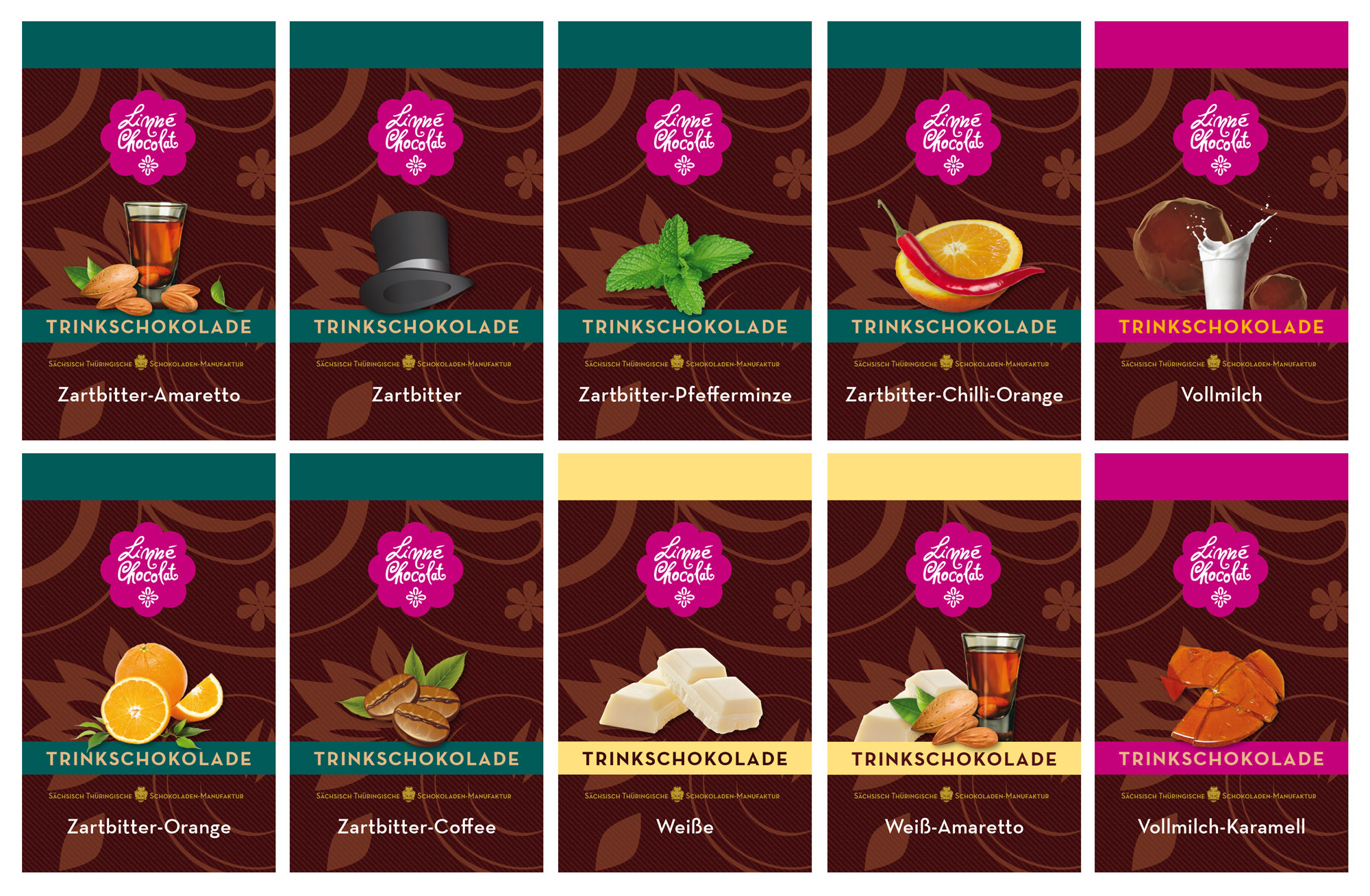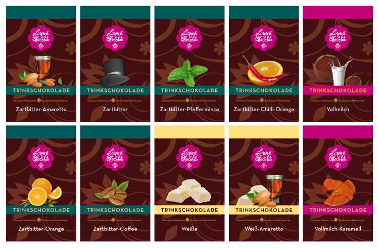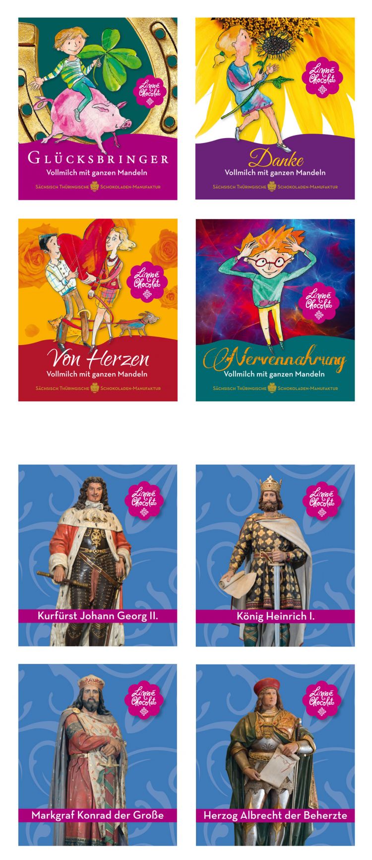 Etiketten für Schokoladentafeln und Trinkschokoladen, Sächsisch-Thüringische Schokoladenmanufaktur, Illustrationen: Sylvia Graupner