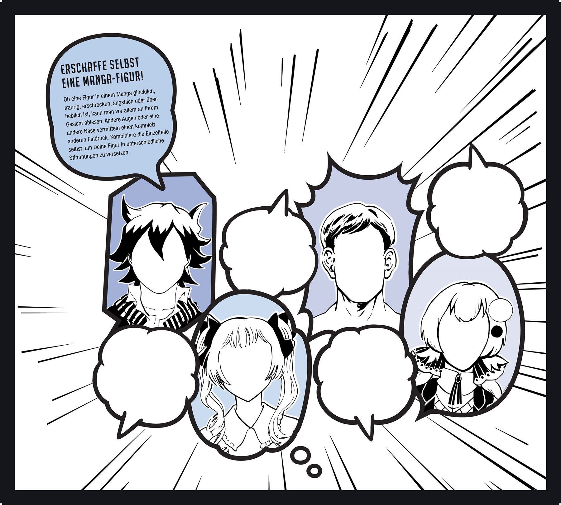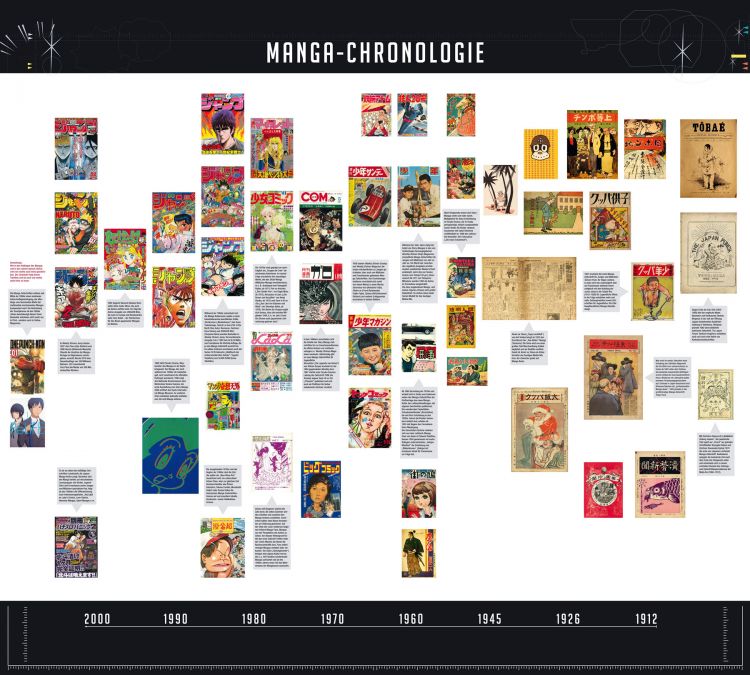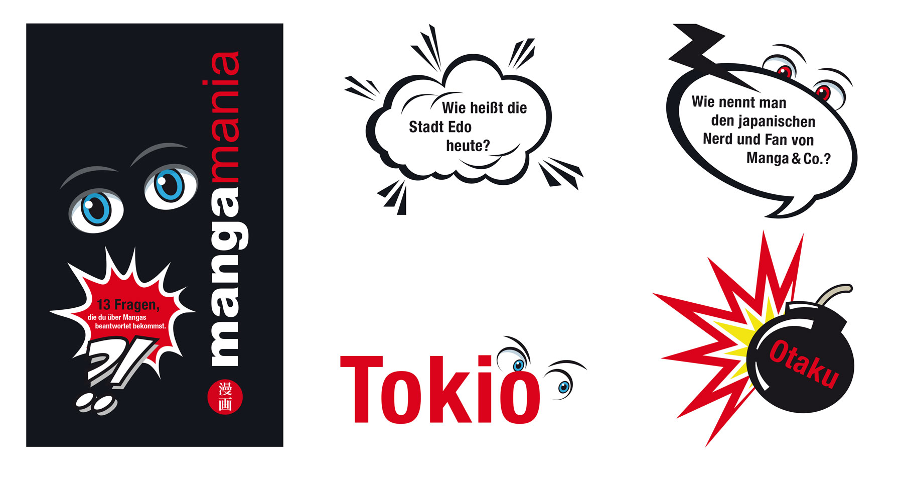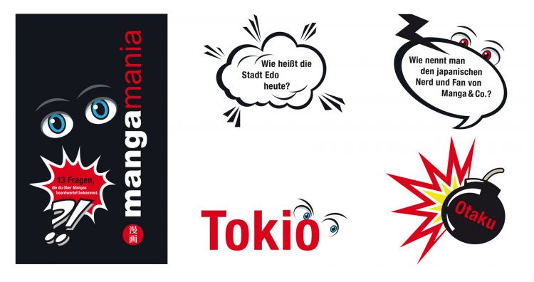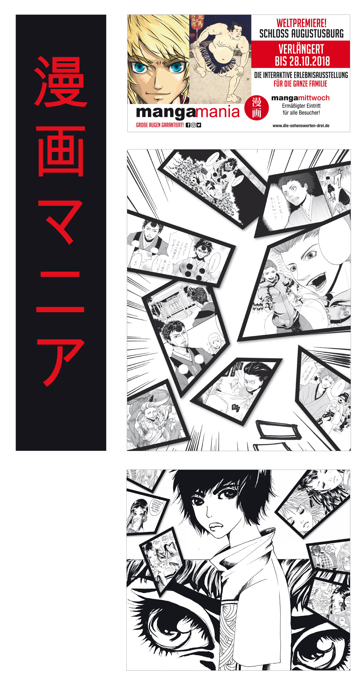 Ausstellung „Mangamania“ auf Schloss Augustusburg (Banner, Plakate, Anzeigen, Tafeln, Buchobjekt, bewegliche Magnettafeln),